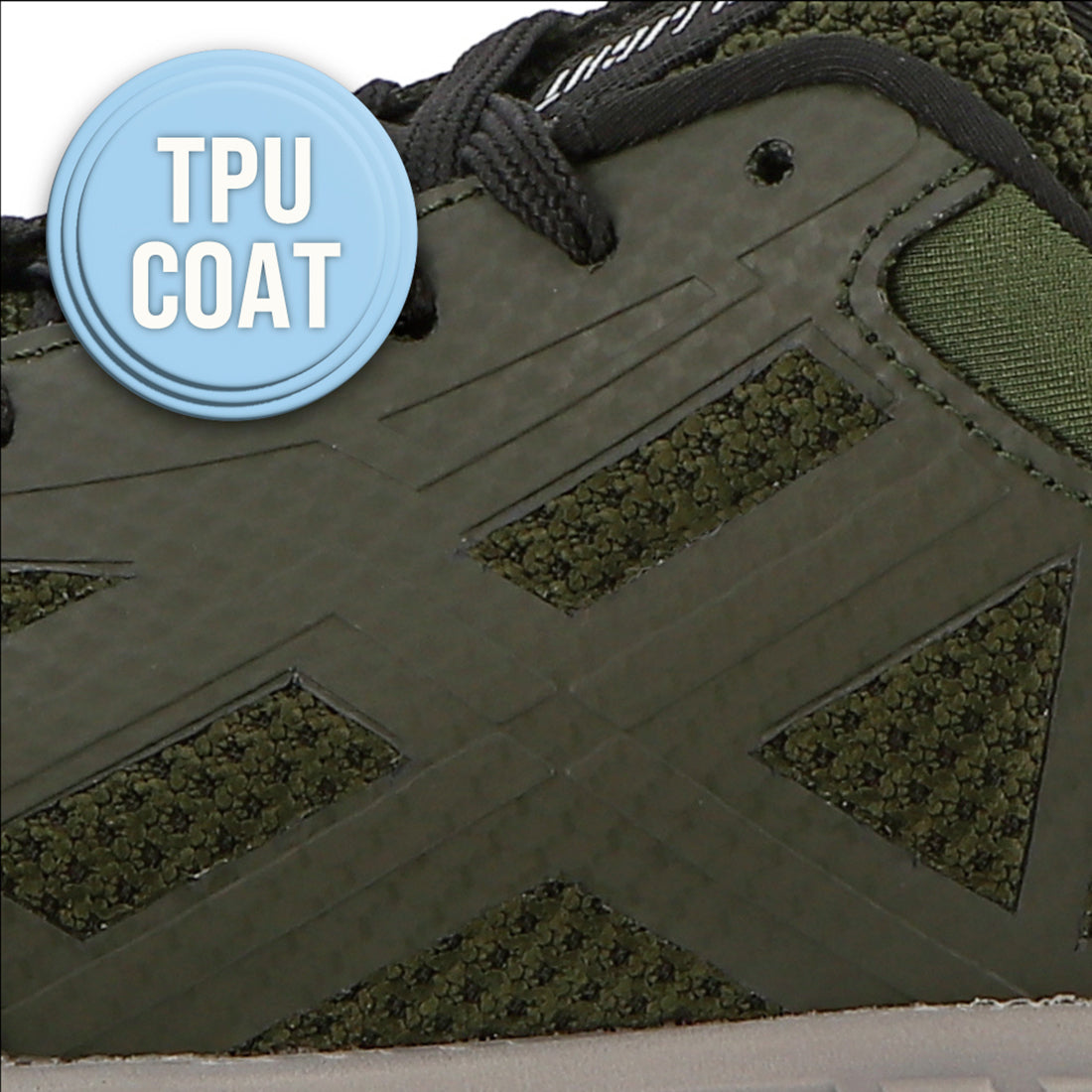 軽量のメッシュアッパーに樹脂シートをコーティングし耐久性をサポート
