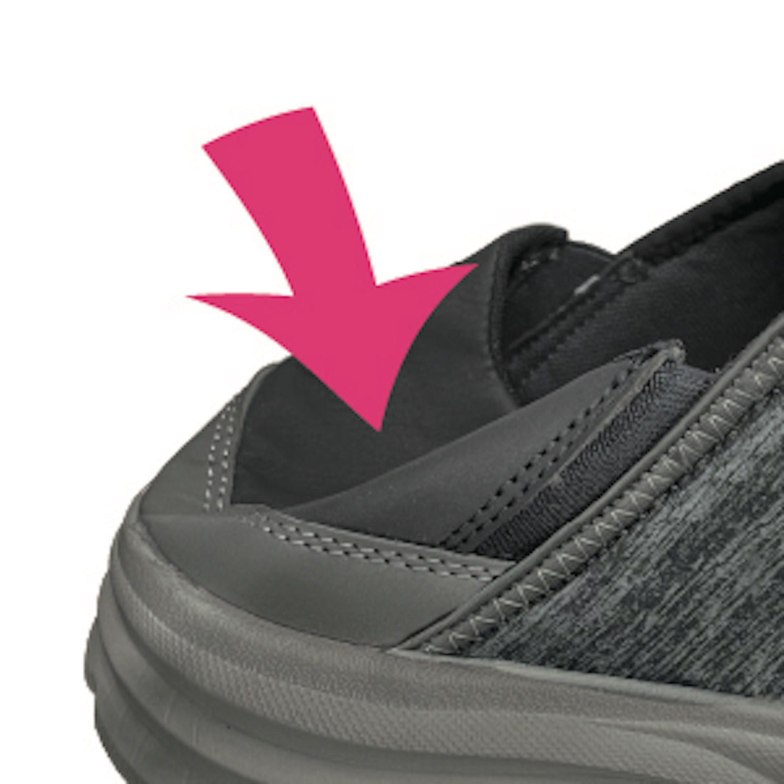 ●脱ぎ履きしやすいスリッポンタイプ。踵部には着脱時に便利なプルストラップ付き