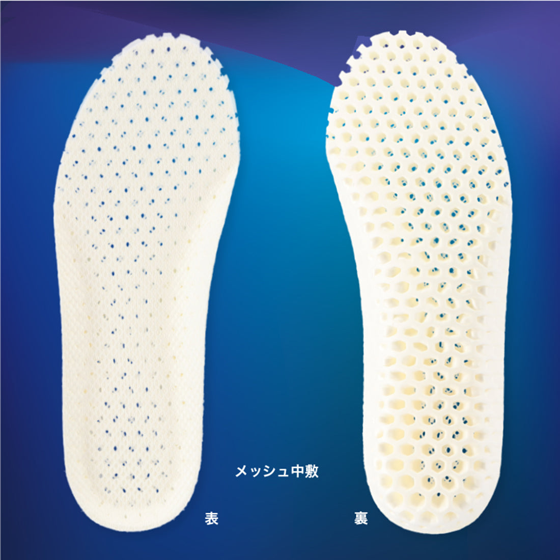 靴内に空洞部分を設置し、汗や湿気を落とし込み、歩くたびに靴内の空気の循環が促され靴内のムレを軽減
