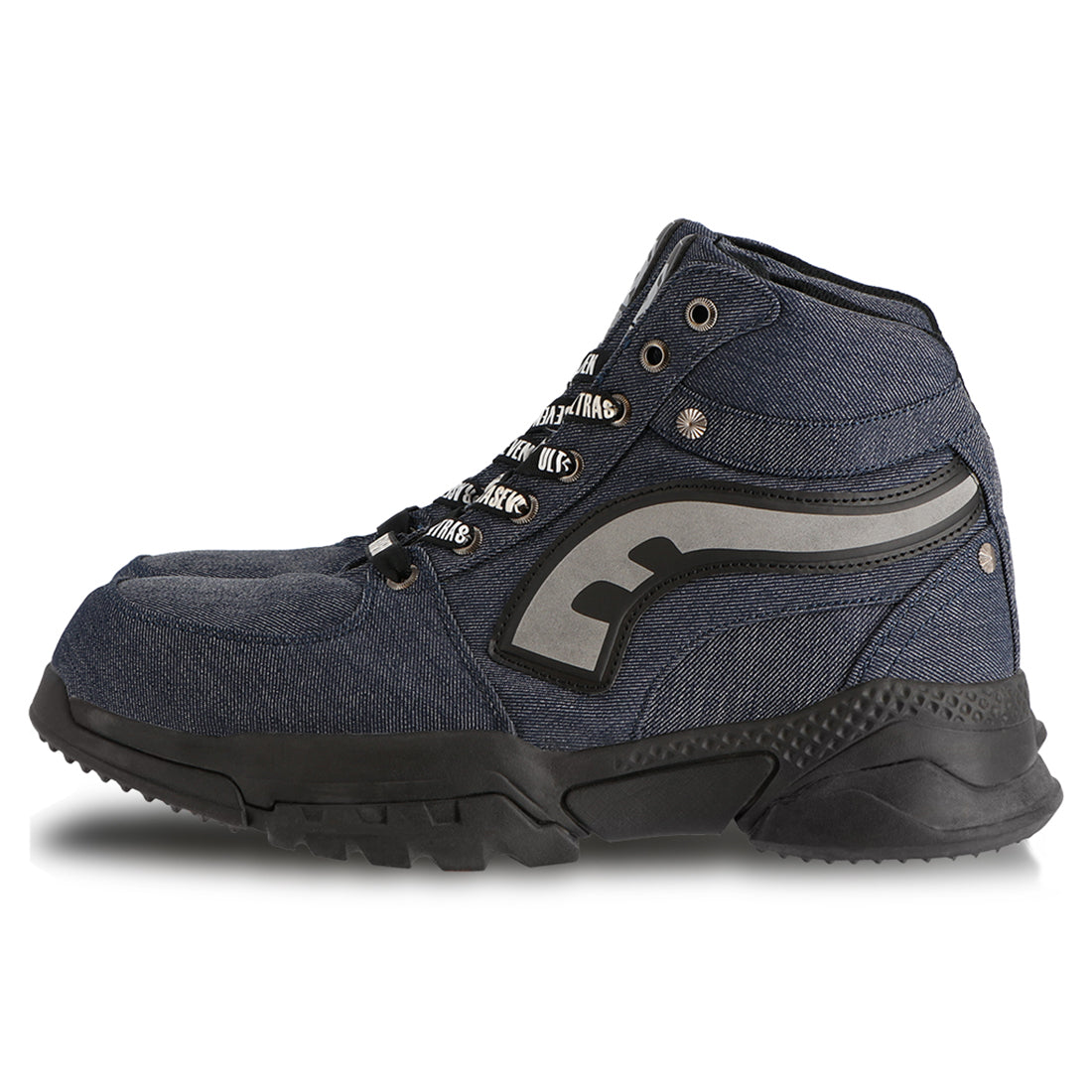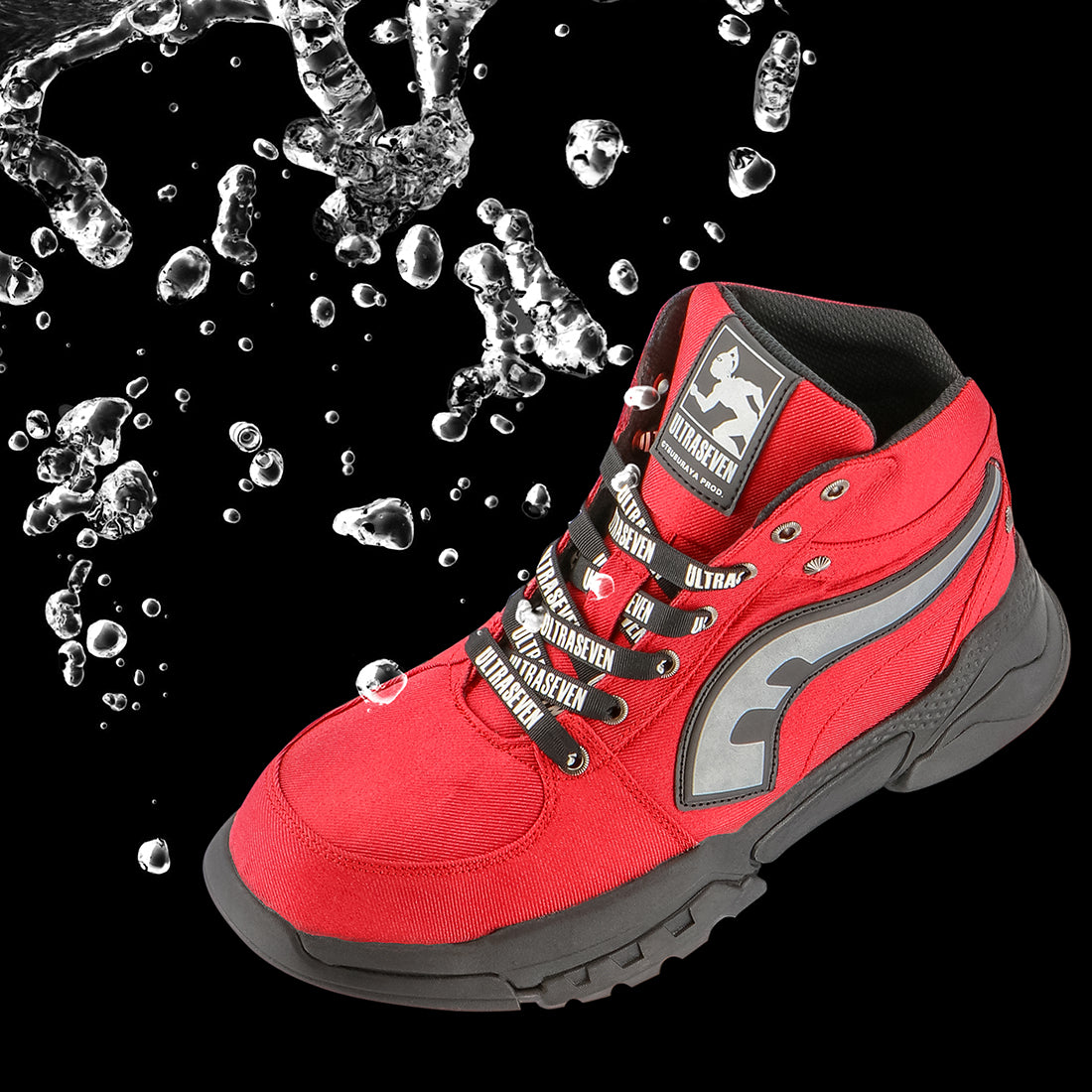「ウルトラセブン」モデル。ウルトラなデザインに、強さ・安心感を兼ね備えた、先芯入りワークシューズ。アッパーには撥水加工デニム生地を採用。
