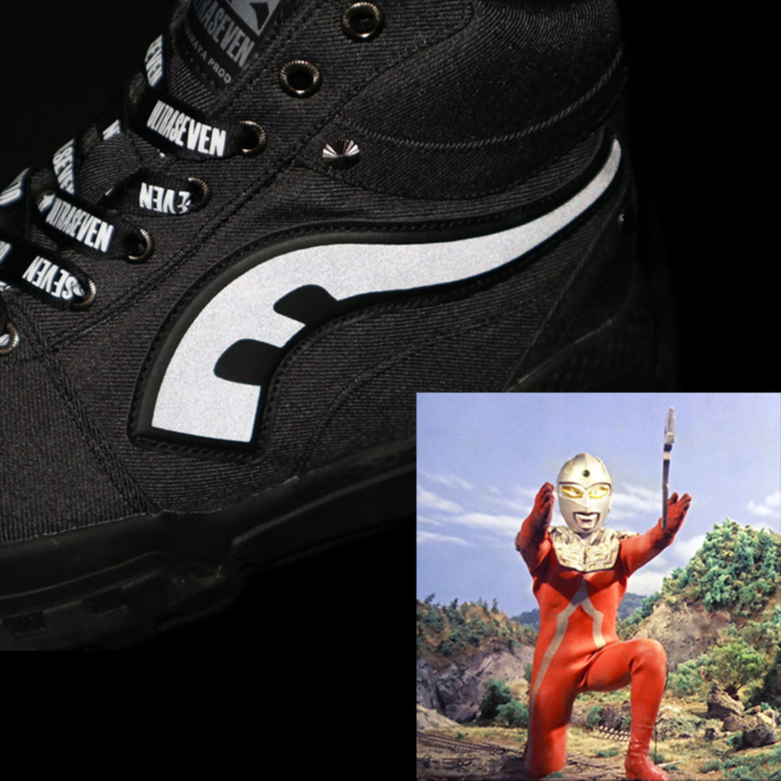 靴のサイドにはウルトラセブンのアイスラッガーをモチーフにした反射素材を使用。暗い場所でライトに当たると光ります。