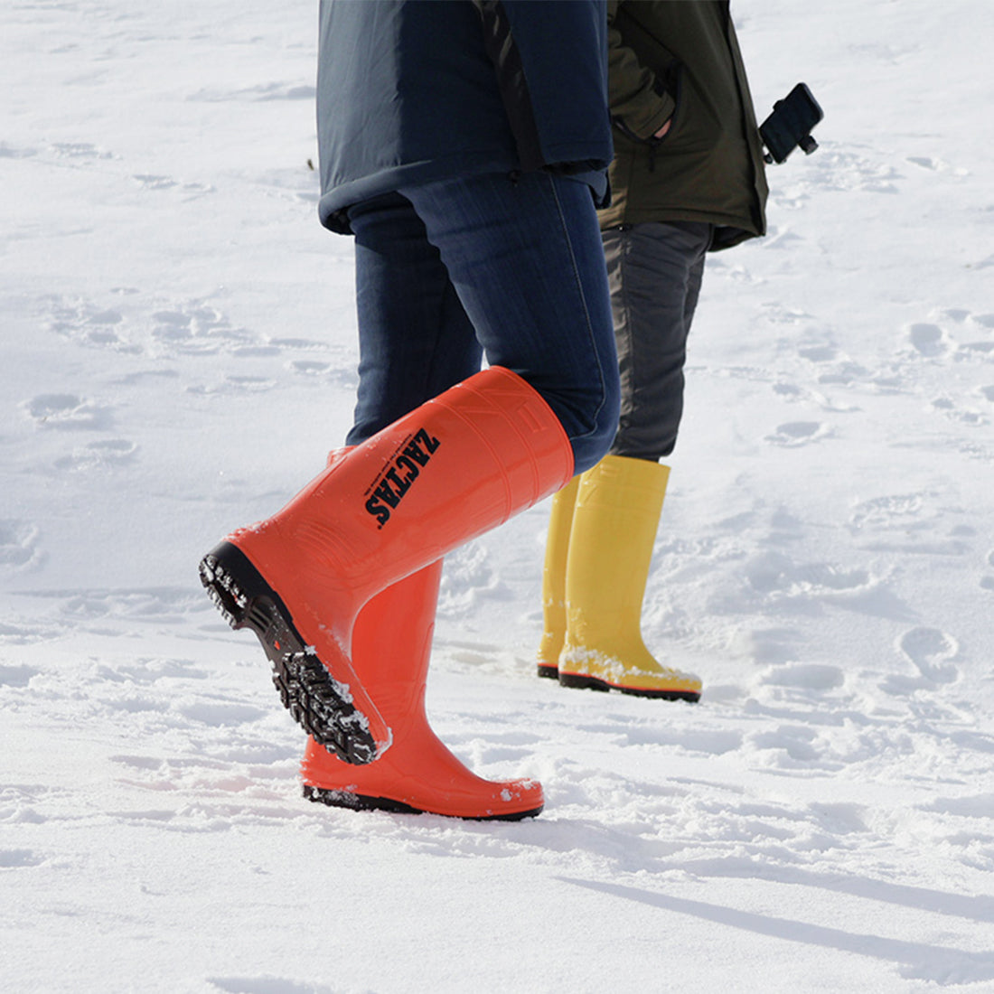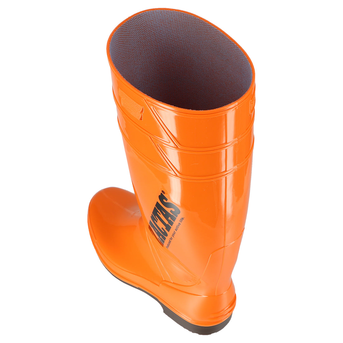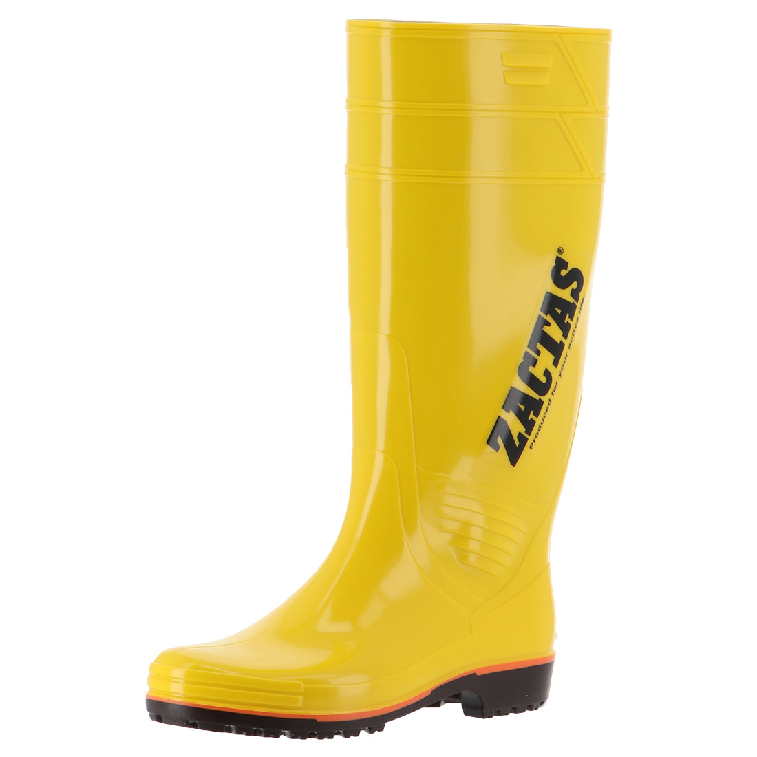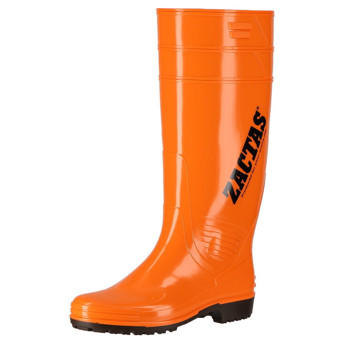 丈が長い耐油性のPVC長靴。オレンジのラインが目印。